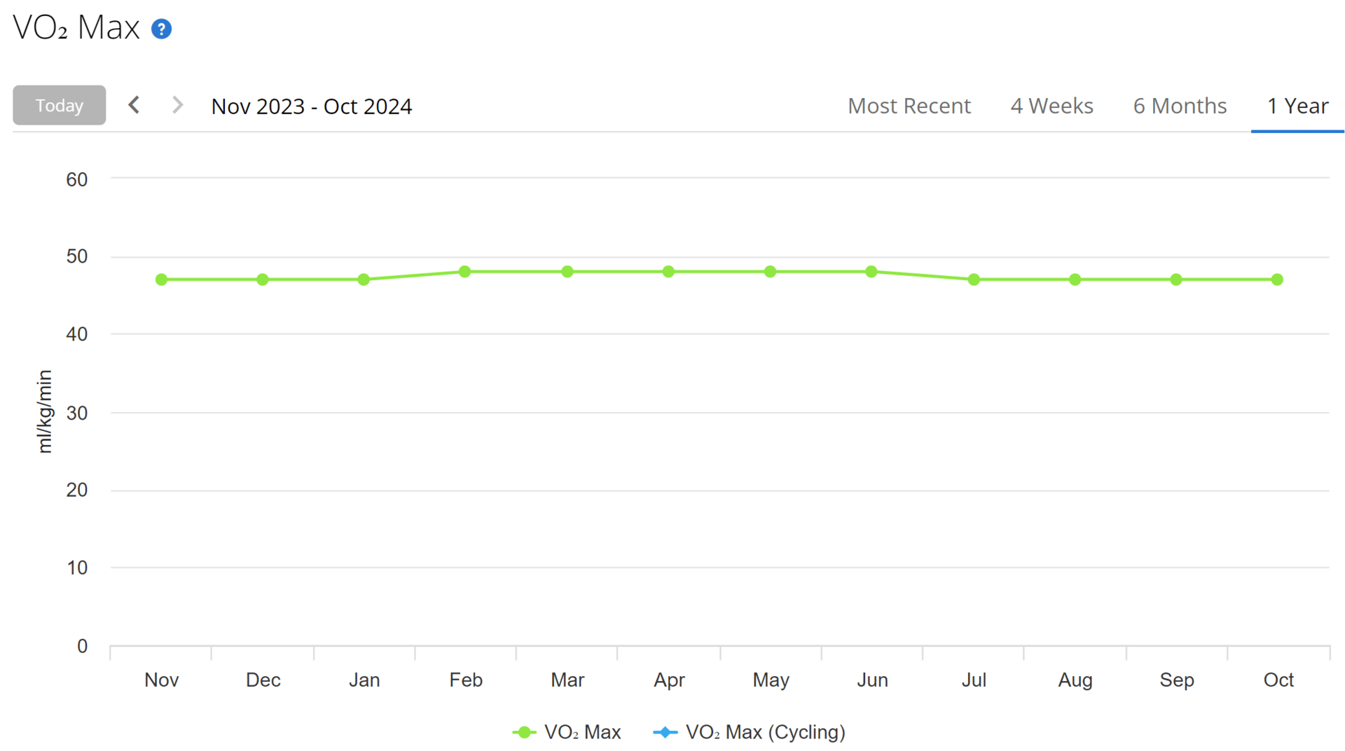 (See the one year graph of my VO2 max readings below)